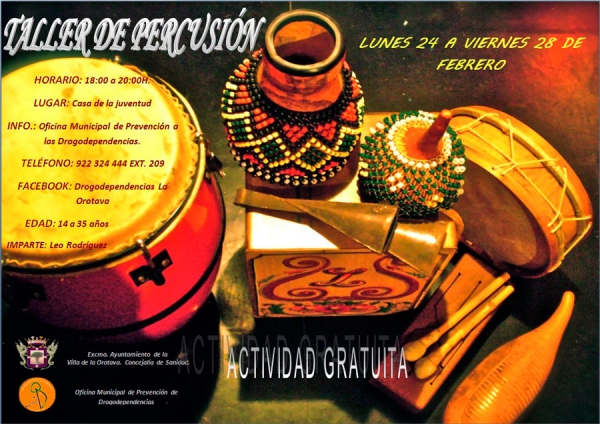 La Concejalía de Drogodependencias del Ayuntamiento de La Orotava continúa ofertando propuestas atractivas para los jóvenes –de 14 a 35 años- del municipio. En esta ocasión vuelve a poner en marcha un nuevo Taller de Percusión que se desarrollará del 24 al 28 de febrero.