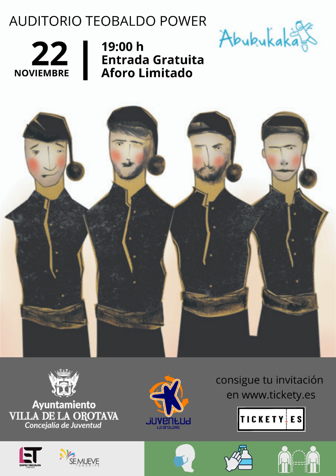 Es importante reseñar que para poder asistir al espectáculo, es necesaria la reserva de entradas, en el siguiente enlace: https://tickety.es/es/events/abubukaka-en-el-auditorio-teobaldo-power?fbclid=IwAR1eF1XFCC0p3f1_aZnRdmfykavZWldYT13_LWnSt8pPUgzbGCAeQBNYT98, teniendo un límite máximo por persona de cuatro entradas y teniendo que indicar si son convivientes o no.