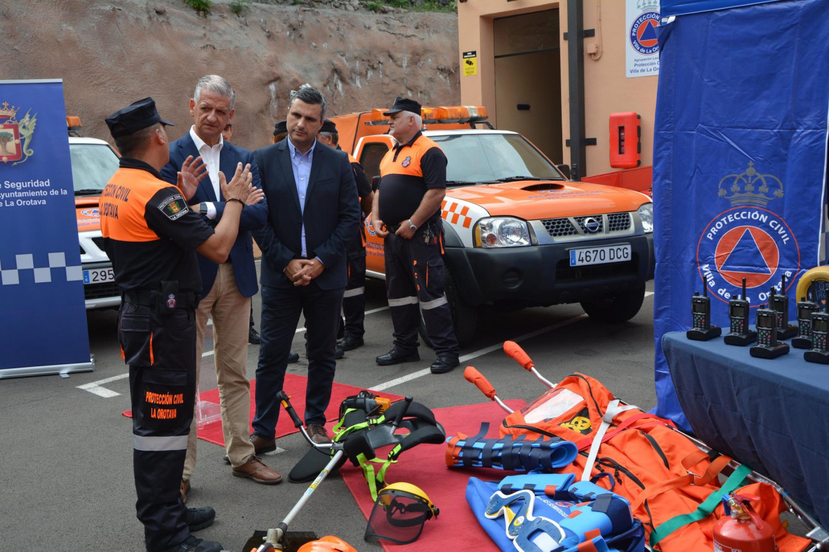 El alcalde de La Orotava, Francisco Linares, junto al concejal de Seguridad Narciso Pérez, han hecho entrega de nuevo material de intervención en emergencias a la Agrupación de Protección Civil de La Orotava.