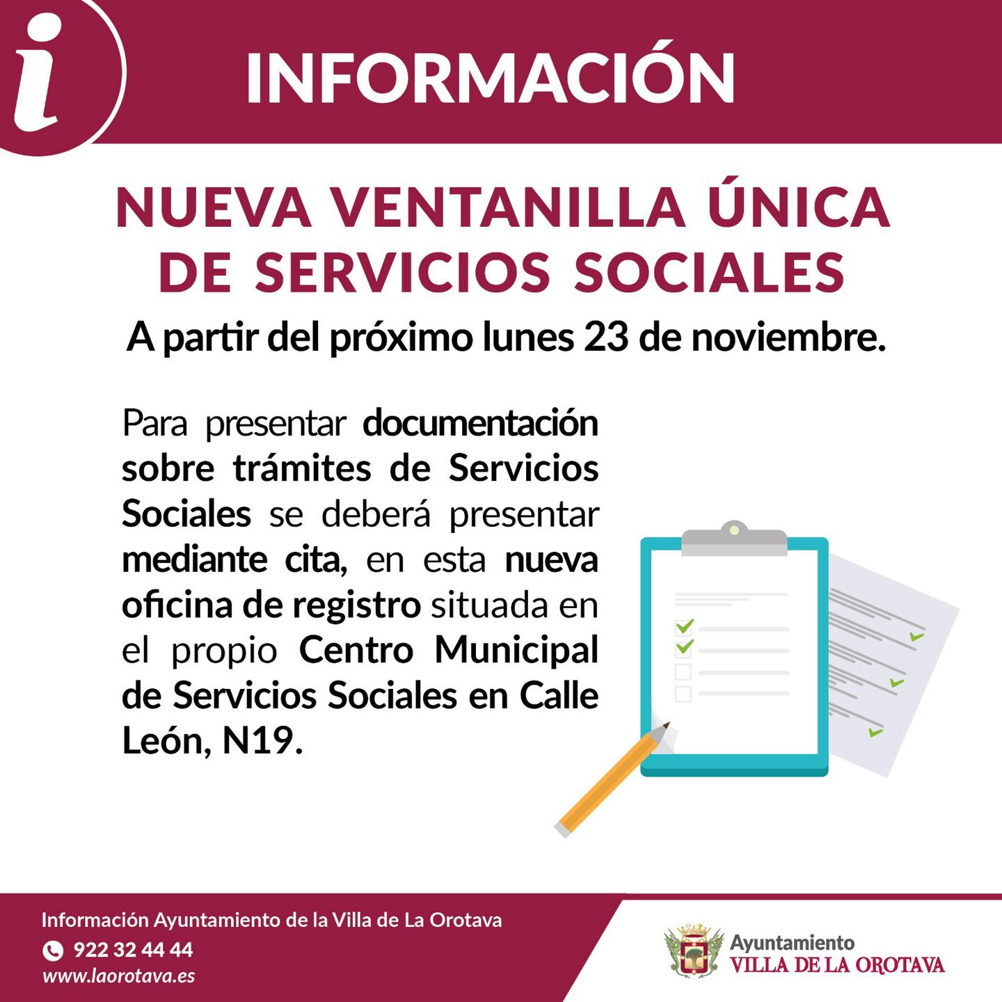 A partir de este lunes 23 de noviembre, el Ayuntamiento de la Villa de La Orotava pone a disposición de los vecinos y las vecinas del municipio la nueva ventanilla única de Servicios Sociales, perteneciente al área de Bienestar Social, cuya responsable es la concejala Belén González.