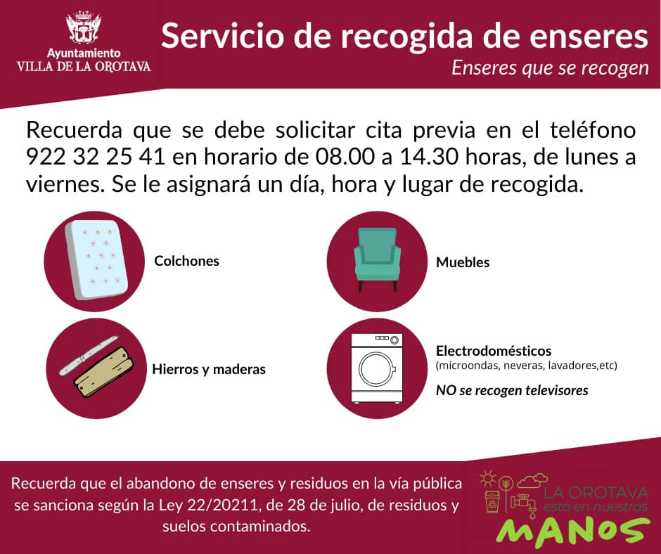 El Ayuntamiento de La Orotava informa de que está a disposición de los vecinos y vecinas del municipio, el servicio de recogida de enseres, con el que se pretende evitar el abandono de los mismos en solares, fincas, cunetas o junto a los contenedores de residuos orgánicos o habilitados para la recogida selectiva.