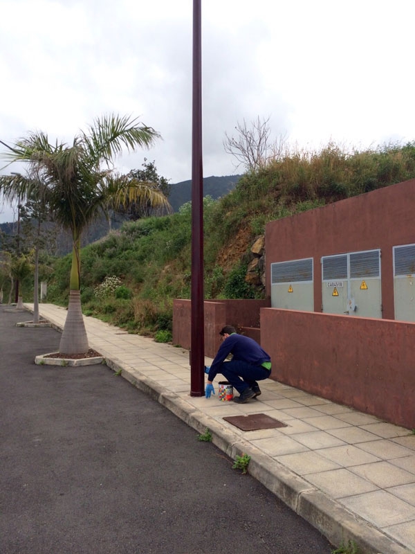 Tras el ya tradicional dispositivo de limpieza de farolas en Semana Santa, los operarios de la empresa concesionaria del mantenimiento de alumbrado exterior, Effico, llevan a cabo los trabajos de pintado y mejora en noventa puntos de luz, en la urbanización Opuntia.