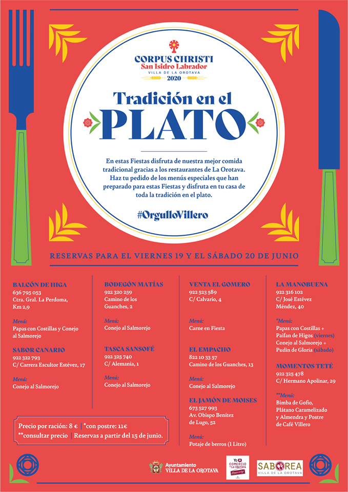 Una de estas iniciativas es ‘Tradición en el plato’, mediante la cual los orotavenses podrán degustar la mejor gastronomía típica en sus domicilios a través de los menús especiales que han elaborado nueve establecimientos de restauración de la localidad. Con unos precios por persona que en la mayoría de los casos es de ocho euros, y con postre, de once euros, ya es posible realizar las reservas para los pedidos, que se despacharán este viernes 19, el sábado 20 y el domingo 21 de junio.