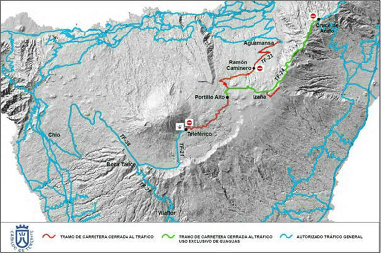 TF-38 desde Chío y TF-21 desde Vilaflor.- Se permite el acceso de todos los vehículos en doble sentido hasta el Teleférico. En dicho punto, se establecerá el cierre de la carretera entre las 8:00 y las 18:00 horas. Los vehículos que alcancen este punto deberán retornar por el sur, no estando permitido el descenso por la TF-21 de La Orotava ni la TF-24 de La Esperanza, en la que solo transitará el transporte público).