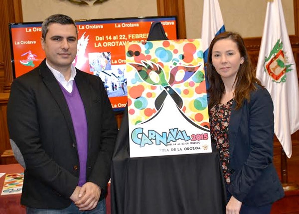 El cartel anunciador de las fiestas de Carnaval 2015 de La Orotava es obra de Damián Rodríguez, y lleva por título " Carnaval, prepara tu disfraz". Es un cartel muy simbólico y esquemático. En él encontramos como elemento principal unas tijeras convertidas en antifaz sobre un fondo de color. Unas tijeras que, a modo de homenaje, refleja el trabajo laborioso de los diseñadores, que confeccionan los magníficos trajes de candidatas, murgas y comparsas, pero también representa a todos y cada uno de los que sintiéndose carnavaleros, toman en esos días unas tijeras y unos trozos de tela y crean su disfraz. Dicho antifaz junto con las tijeras forman una cara, siendo las cuchillas los bigotes de la misma. Un antifaz-tijera, que corta la tela multicolor que se encuentra detrás y llena el fondo. La tela creada por muchos confetis de colores, transmite el colorido y diversión de estas fechas. A su vez, esta tela cortada crea una abertura que asemeja al trazado de una calle de la Villa siempre caracterizadas por sus pendientes. De esta manera, la tela cortada parece ser un arco de bienvenida al carnaval de La Orotava.