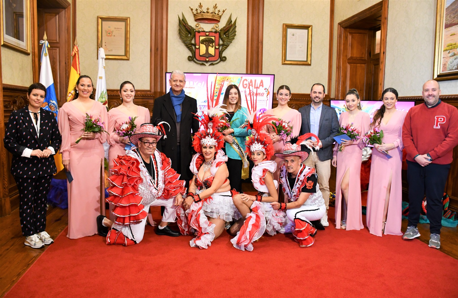 Ya se respira a carnaval en La Orotava. Este viernes [10 de febrero] se ha presentado el variopinto programa de actos que se desarrollará entre el próximo viernes 17 y el domingo 26 de febrero. La presentación estuvo a cargo del alcalde de la Villa, Francisco Linares; el edil de Fiestas, Alexis Pacheco; el representante de los grupos del carnaval orotavense y miembro de la Peña El Casco que este año cumple su 60 aniversario, Mario Martín, y el diseñador del Cartel, Mario Afonso. Además, el acto contó con las candidatas a reina, procediéndose también al sorteo para el orden de participación. El Salón de Plenos, ambientado para la ocasión, contó también con la última reina del carnaval (2020) Nayra González; representantes de la comparsa Los Villeros ataviados con su disfraz; de las empresas que presentan candidata y de otros colectivos participantes, y los diseñadores Sergio López e Itahisa García, entre otros.
