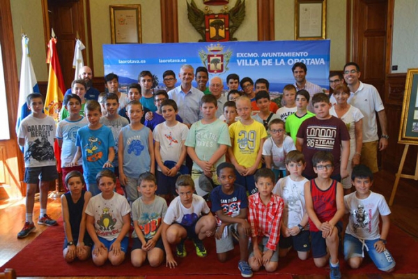 El alcalde de La Orotava, Francisco Linares, recibe en el Salón Noble del Ayuntamiento al Coro de la Escolanía de la Abadía Benedictina de la Santa Cruz en su visita cultural a Canarias.