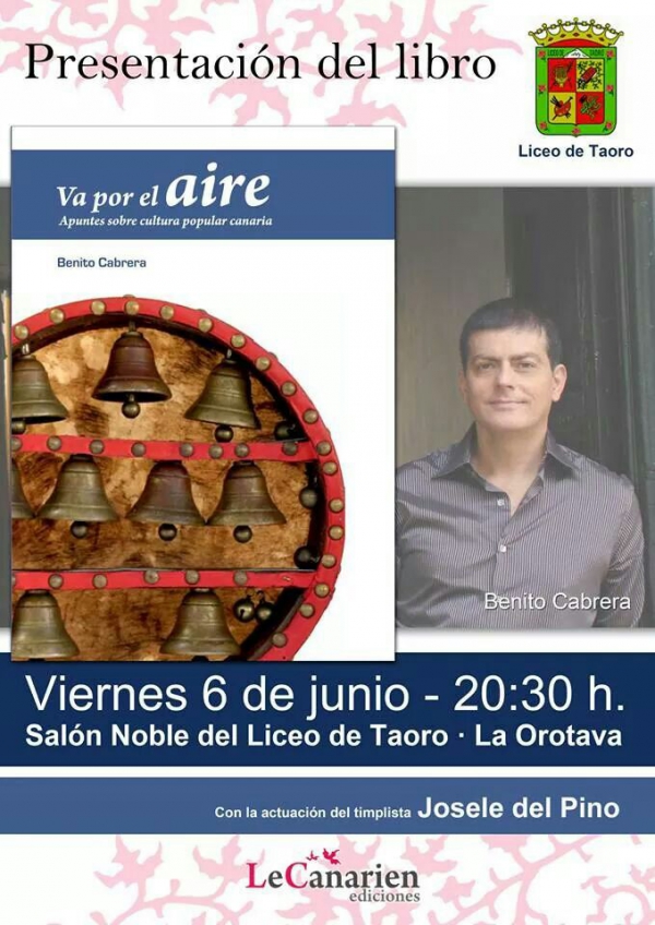 Este próximo viernes 6 de junio a las 20:30 h., en el Sala Noble del Liceo de Taoro de La Orotava (Plaza de la Constitución, 6), tendrá lugar el acto de presentación del libro "Va por el aire: apuntes sobre cultura popular canaria", del timplista e investigador Benito Cabrera. El acto contará además con la actuación musical del timplista Josele del Pino.