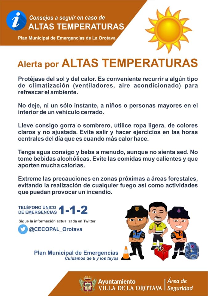 Desde el Área de Seguridad del Ayuntamiento de La Orotava informamos que el Cabildo de Tenerife ha prohibido la quema de rastrojos y el uso de fogones en las áreas recreativas tras la declaración de alerta por altas temperaturas decretada por el Gobierno de Canarias a partir de este viernes.