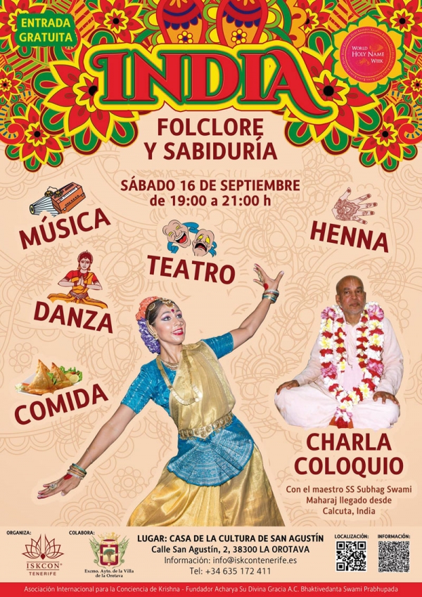 “India Folclore y sabiduría” es una muestra de la riqueza cultural y espiritual de la India. Además de la charla que ofrecerá Subhag Swami, en el evento se contará con teatro, tatuajes de Henna, degustaciones, y las danzas de Bharatanatyam, considerado como uno de los estilos de danza clásica más antiguo de la India. Es una danza profundamente mística porque nace dentro de la filosofía y religión hindú, convirtiéndose en una bella disciplina que requiere de un arduo trabajo corporal y mental. El Bharatanatyam incluye cuatro actividades: expresión, música, ritmo, danza; que son bellamente reunidas por quienes bailan. Las danzas correrán a cargo de Mahima Sandoval, quien lleva más de 20 años en el sector artístico.