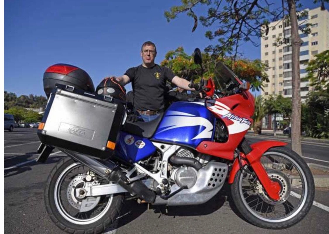 Serán 5.500 kilómetros durante algo más de 15 días. Una auténtica aventura para la que cuenta con su Honda Africa Twin de 2002. Apareció ayer en el momento de la despedida cargado de maletas sobre su potente moto, pero realmente, asegura, “llevo apenas lo básico para tantos días”.