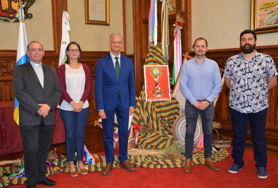 El programa de actos, junto al cartel, fue presentado en la mañana de este lunes [13 de mayo] en el Salón Noble de la Casa Consistorial, de la mano del alcalde Francisco Linares y la concejala de Fiestas, Delia Escobar. También se contó con el edil de Agricultura, Alexis Pacheco, el párroco de la Iglesia de La Concepción, Óscar Guerra, y el autor del cartel, Eduardo Rodríguez.