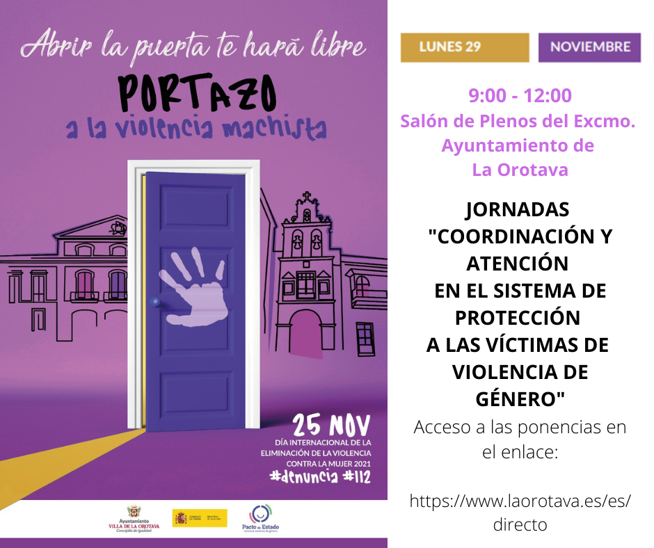 El Salón de Plenos del Ayuntamiento de La Orotava será el escenario donde se celebre este lunes 29 de noviembre, entre las 9:00 y las 12:00 horas, del desarrollo de las ‘Jornadas Coordinación y Atención en el Sistema de Protección a las víctimas de Violencia de Género’, una acción incluida dentro del programa de actividades organizado por la Concejalía de Igualdad para la celebración del ‘Día Internacional de la Eliminación de la Violencia contra la Mujer’.