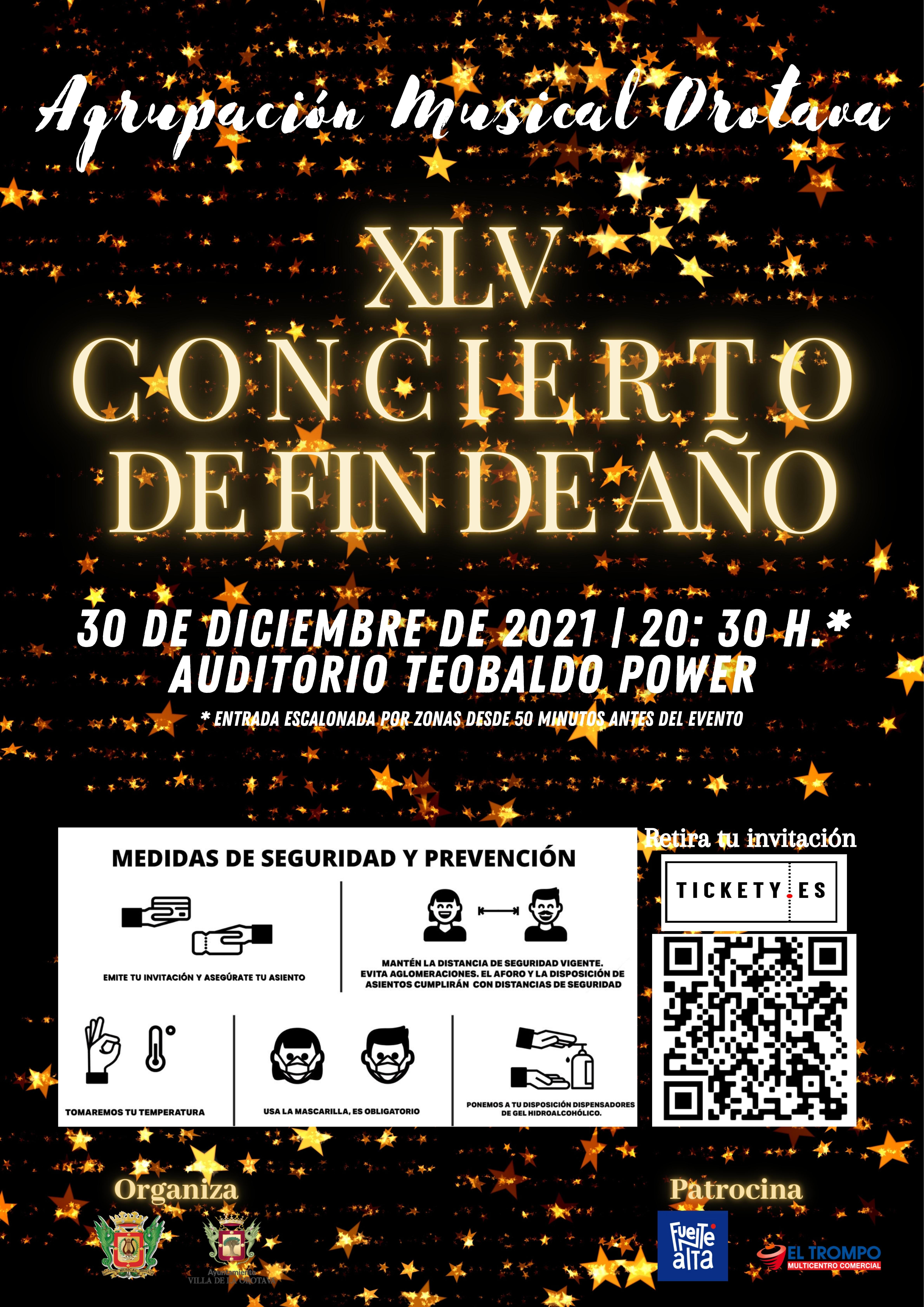El Auditorio Teobaldo Power de la Villa de La Orotava acogerá el 30 de diciembre, a partir de las 20.30 horas, el XLV Concierto Extraordinario de Fin de Año de la Agrupación Musical Orotava, un evento esperado cada año por estas fechas navideñas. Este tradicional concierto se ha convertido en una de las citas culturales más importantes de la isla, ofreciendo siempre un programa especial para despedir cada año. Las invitaciones para poder acudir a la tradicional cita serán nominativas y se deben retirar a través de la plataforma de eventos online www.tickety.es y en el siguiente enlace: