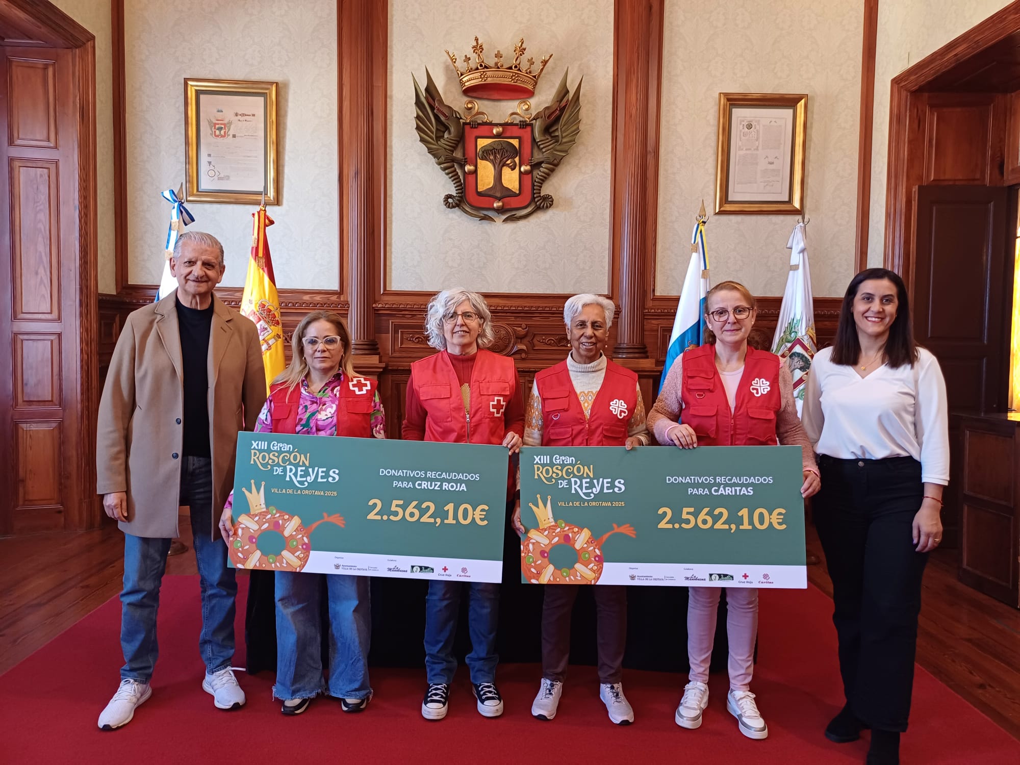 El alcalde de La Orotava Francisco Linares y la concejala delegada de Comercio, Deysi Ramos, han entregado en la mañana de este miércoles 8 de enero, en la Casa Consistorial, la recaudación obtenida en el reparto del gran Roscón de Reyes que se ofreció el pasado 4 de enero en la zona de Emilio Luque como acto dinamizador de la zona comercial abierta, incluido en el amplio programa de actividades navideñas y que en cada edición es todo un éxito. Este día ya está marcado en el calendario de muchos villeros y de los numerosos visitantes que acuden a la cita.
