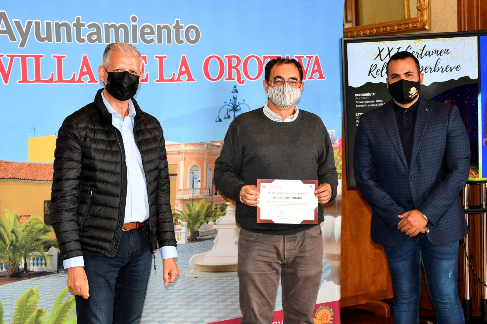 El alcalde de La Orotava, Francisco Linares, acompañado del concejal de Juventud del Ayuntamiento orotavense, Darío Afonso, fueron los encargados de entregar, recientemente, los premios a los ganadores del XXI Certamen de Relato Hiperbreve, organizado por el área de Juventud.