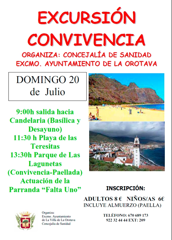 La Concejalía de Sanidad ha organizado una excursión-convivencia para el domingo 20 de julio. Este día comenzará con una visita a la Basílica de la Candelaria, luego se continuará con una visita a la Playa de las Teresitas y se continuará la excursión en el Parque de Las Lagunetas, donde se servirá el almuerzo -una paellada- y se pasará una jornada de convivencia vecinal que estará animada por la Parranda "Falta uno".