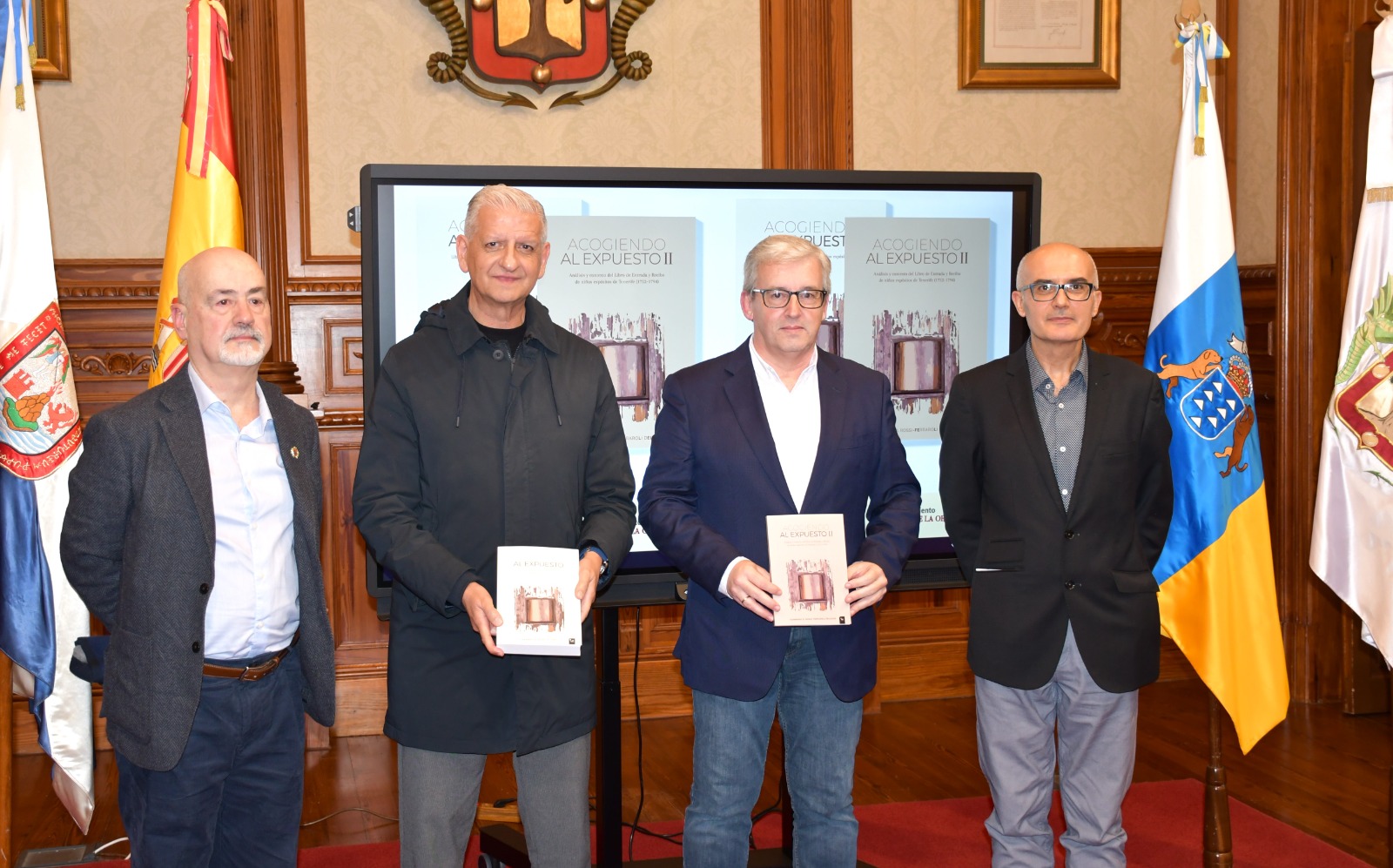 El Salón de Plenos del Ayuntamiento de La Orotava acogió en la tarde de este pasado miércoles [24 de enero] la presentación del libro de Fernando Rossi-Ferraroli Delgado ‘Acogiendo al expuesto’, que consta de dos volúmenes: la transcripción del Libro de Entrada y Recibo de niños expósitos de Tenerife en el periodo 1752-1794, y el análisis y contexto de dicho documento. El acto fue presidido por el alcalde Francisco Linares; José Antonio González, profesor de la ULL y miembro correspondiente de la Real Academia Matritense de Heráldica y Genealogía; Sergio Oliva, vicepresidente de la Sociedad de Estudios Genealógicos y Heráldicos de Canarias (SEGEHECA), y el propio autor, experto universitario en Genealogía, Heráldica y Nobiliaria; Director de la revista Labor et constantia, y presidente fundador de la Sociedad de Estudios Genealógicos y Heráldicos de Canarias