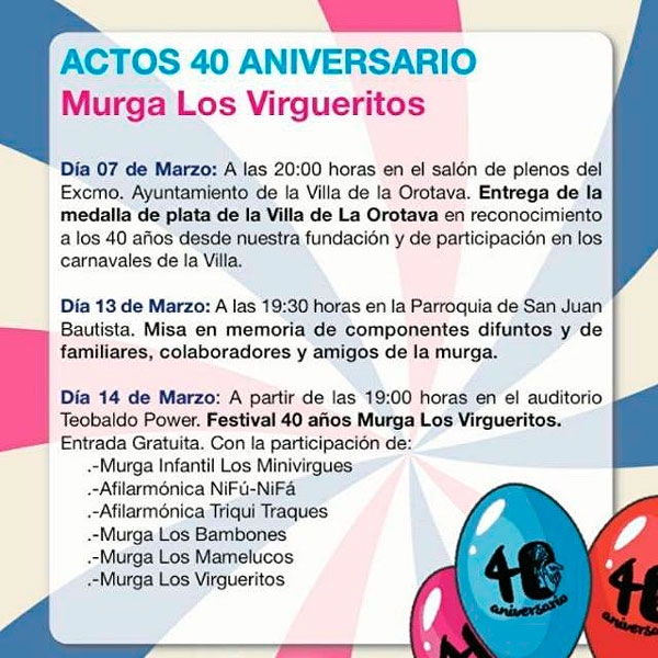 El Auditorio Teobaldo Power acoge mañana 14 de marzo, a partir de las 19:00 horas, el Festival 40 años Murga Los Virgueritos. La entrada es gratuita.