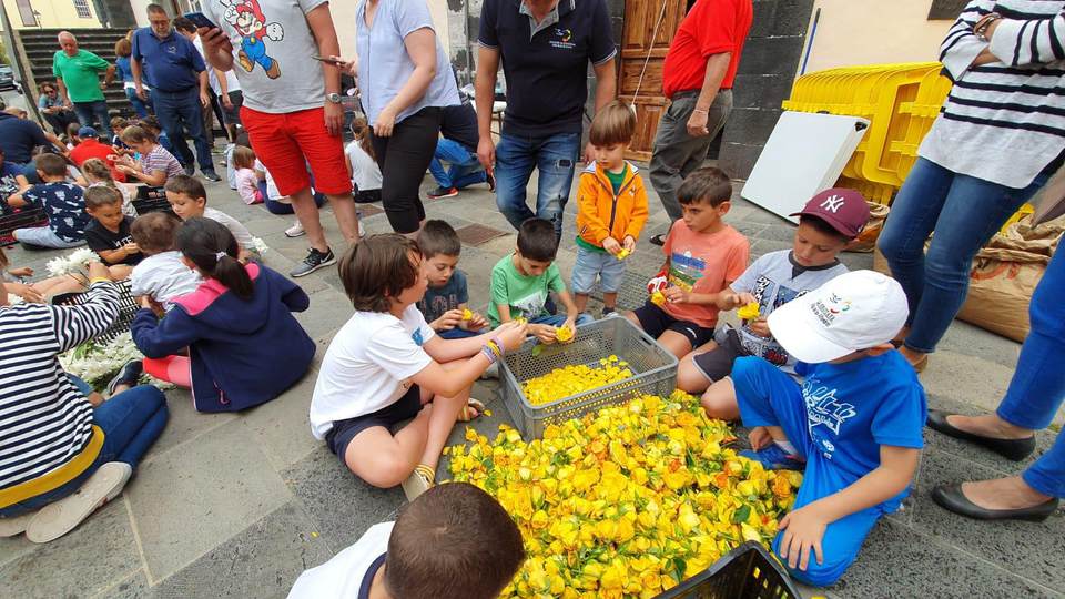 Cerca de un centenar de niños, acompañados de sus padres o familiares, disfrutaron el pasado sábado 15 de junio, en el entorno de la Iglesia de la Concepción, de una jornada lúdico-didáctica diferente: aprendieron jugando y de forma amena el arte efímero de confeccionar alfombras de flores. A lo largo de la mañana trazaron el dibujo y boceto de varios tapices y confeccionaron con flores los mismos. Se sigue la tradición de los moldes de madera y metal para los distintos diseños. Pero, previamente, estos pequeños artistas participaron en el propio deshoje para obtener el material. Así, durante la jornada aprenden todo lo relacionado con las alfombras y descubren las distintas dificultades en el proceso. Valoran in situ las texturas, colores y grados de delicadeza de las propias flores, y conocen de primera mano las técnicas de cómo echar los pétalos y el brezo o cómo usar los colores para componer las alfombras, figuras y corridos. Y también aprendieron términos como zaragata, tapiz, corrido. Además, los niños que disfrutaron de este día especial conocieron de cerca los bocetos de la primera alfombra en honor al Corpus Christi que se confeccionó hace cien años en la Plaza del Ayuntamiento por el alfombrista Felipe Machado. Los niños, finalmente, participaron en el momento de deshacer los tapices, pues no hay que olvidar que se trata de un arte efímero.