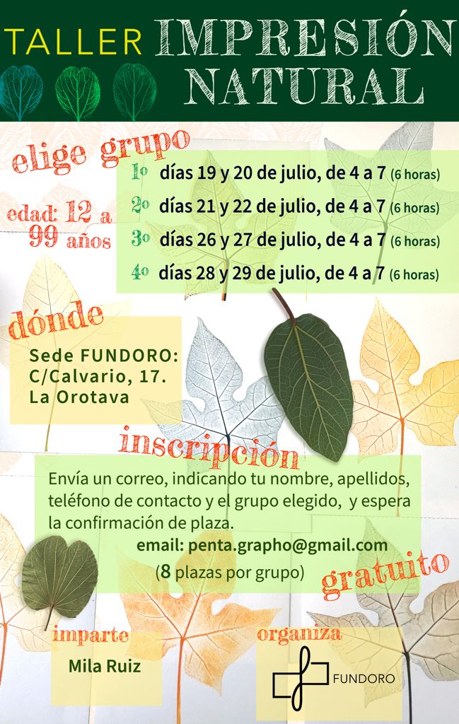 La Fundación Canaria Orotava de Historia de La Ciencia (Fundoro) organiza durante el mes de julio un ‘Taller de Impresión Natural’ gratuito, impartido por Mila Ruiz, que se desarrollará en grupos de hasta ocho personas en la sede de la entidad, situada en la calle Calvario, nº 17.