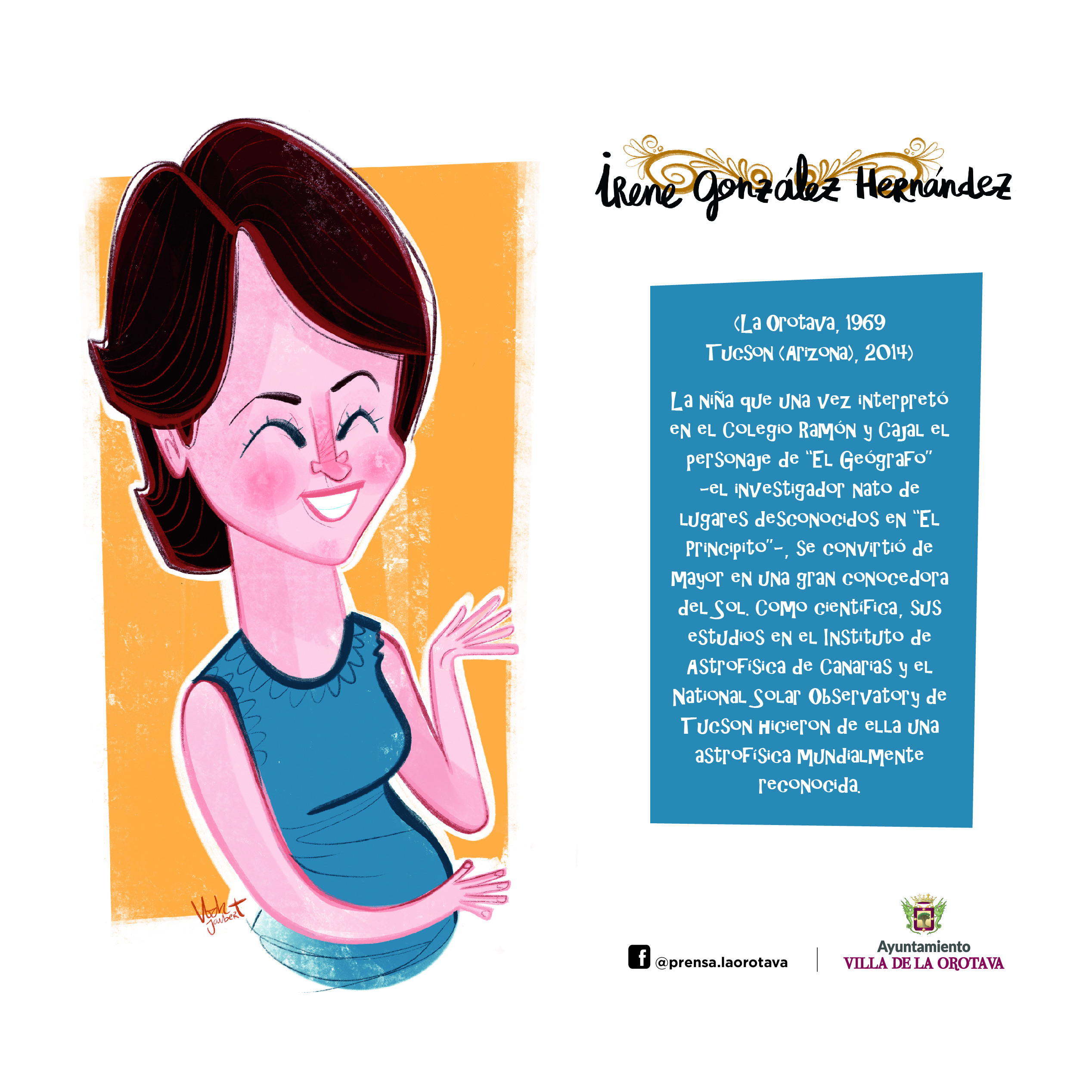 El Ayuntamiento de La Orotava, a través del área de Educación y Cultura que dirige el propio alcalde Francisco Linares, continúa con su iniciativa de dar a conocer a la población en general parte de la historia local y de los villeros y villeras más ilustres, algunos populares y otros desconocidos para muchos. Para hacerlo de forma atractiva, se ha elegido la publicación progresiva de curiosas láminas en las que aparece una breve información de los principales aspectos y acontecimientos de la vida del personaje en cuestión, acompañado de una representación de su figura de la mano del ilustrador Víctor Jaubert.