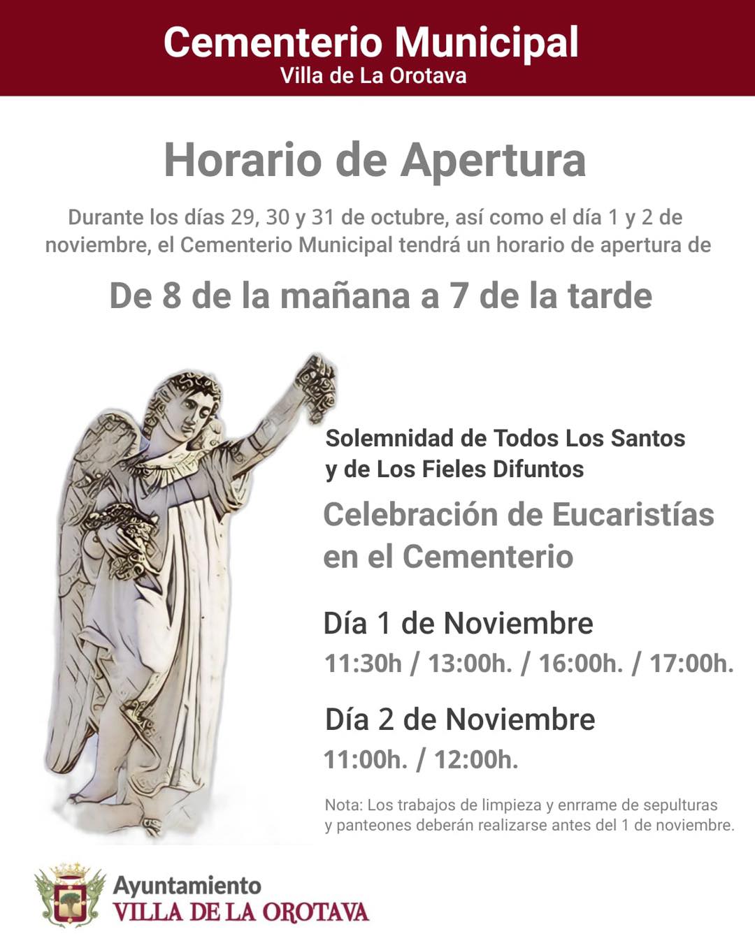 Horarios del cementerio municipal por el 𝕯𝖎́𝖆 𝖉𝖊 𝕱𝖎𝖓𝖆𝖉𝖔𝖘 El ayuntamiento de La Orotava prepara  el cementerio municipal para recibir a las miles de personas que deseen visitarlo en estas especiales fechas.  Por ello también se amplían los horarios para facilitar las visitas en  la Celebración del Día de Todos los Santos y los Fieles Difuntos.