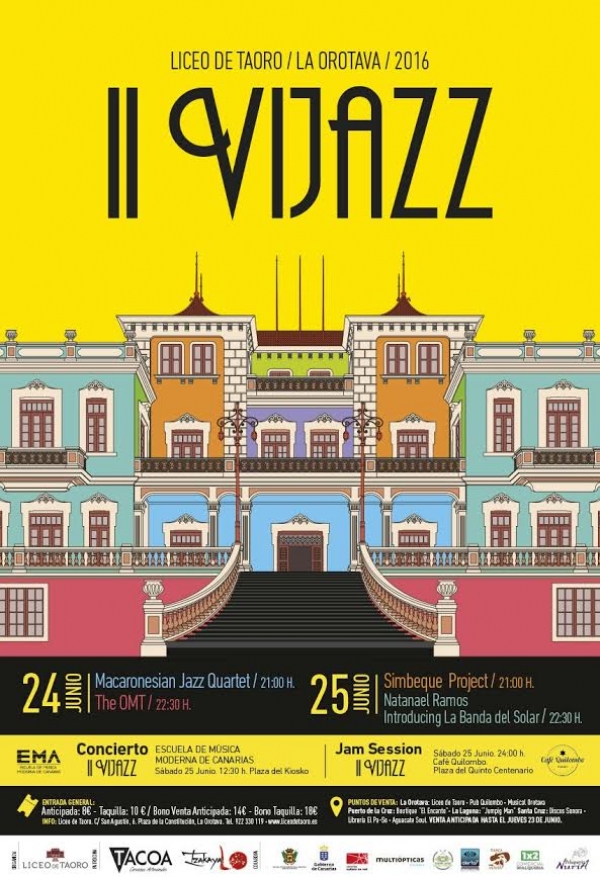 La Sociedad Liceo de Taoro de la Villa de La Orotava tiene el placer de anunciar la II Edición del Festival Vijazz Liceo de Taoro 2016. Con la misma ilusión y determinación de hace un año, el equipo de organización del festival perfila los últimos preparativos para esta segunda edición que tendrá lugar los días 24 y 25 de Junio en las instalaciones del propio Liceo.