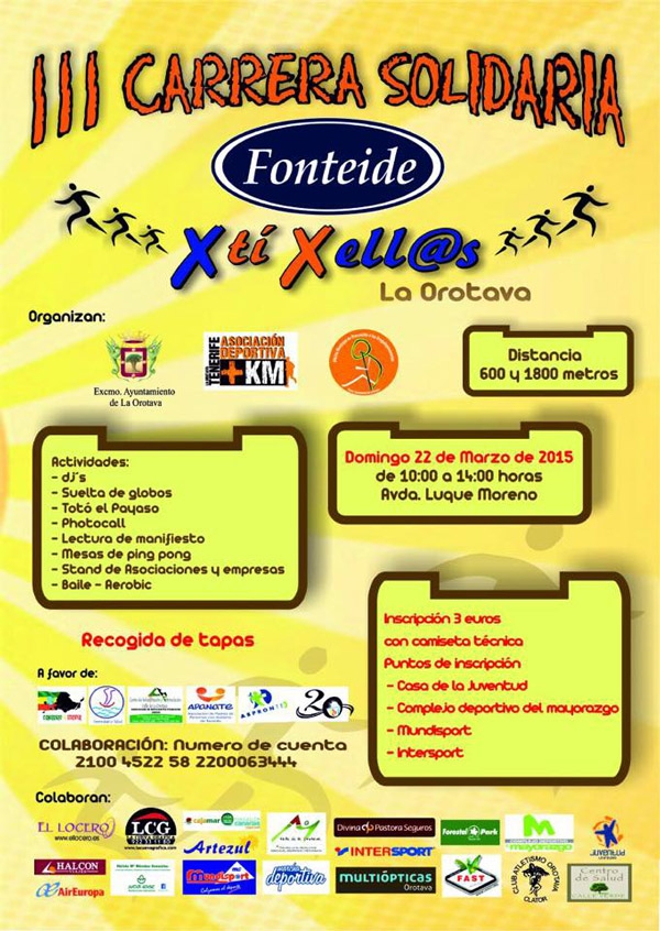 La III Carrera "POR TI, POR ELL@S", se llevará a cabo el Domingo 22 de Marzo de 2015desde las 10 hasta 14 horas en La Orotava. Se tiene previsto, anterior al inicio de la prueba, se realice la lectura de un manifiesto sobre la solidaridad y una suelta de globos.