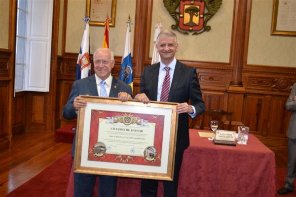 Isaac Valencia Domínguez, quien fue alcalde de La Orotava durante más de 30 años, es ya Villero de Honor de su pueblo natal. Ayer, en un emotivo acto en el Salón Noble de la Casa Consistorial, lleno hasta la bandera, recibió esta merecida distinción, otorgada por el Pleno de la corporación municipal celebrado el pasado mes de febrero en reconocimiento a su labor durante tres décadas al frente de la institución y en pro del pueblo orotavense (aprobado con la mayoría de los grupos: CC, PSOE y PP, y en contra de IpO).