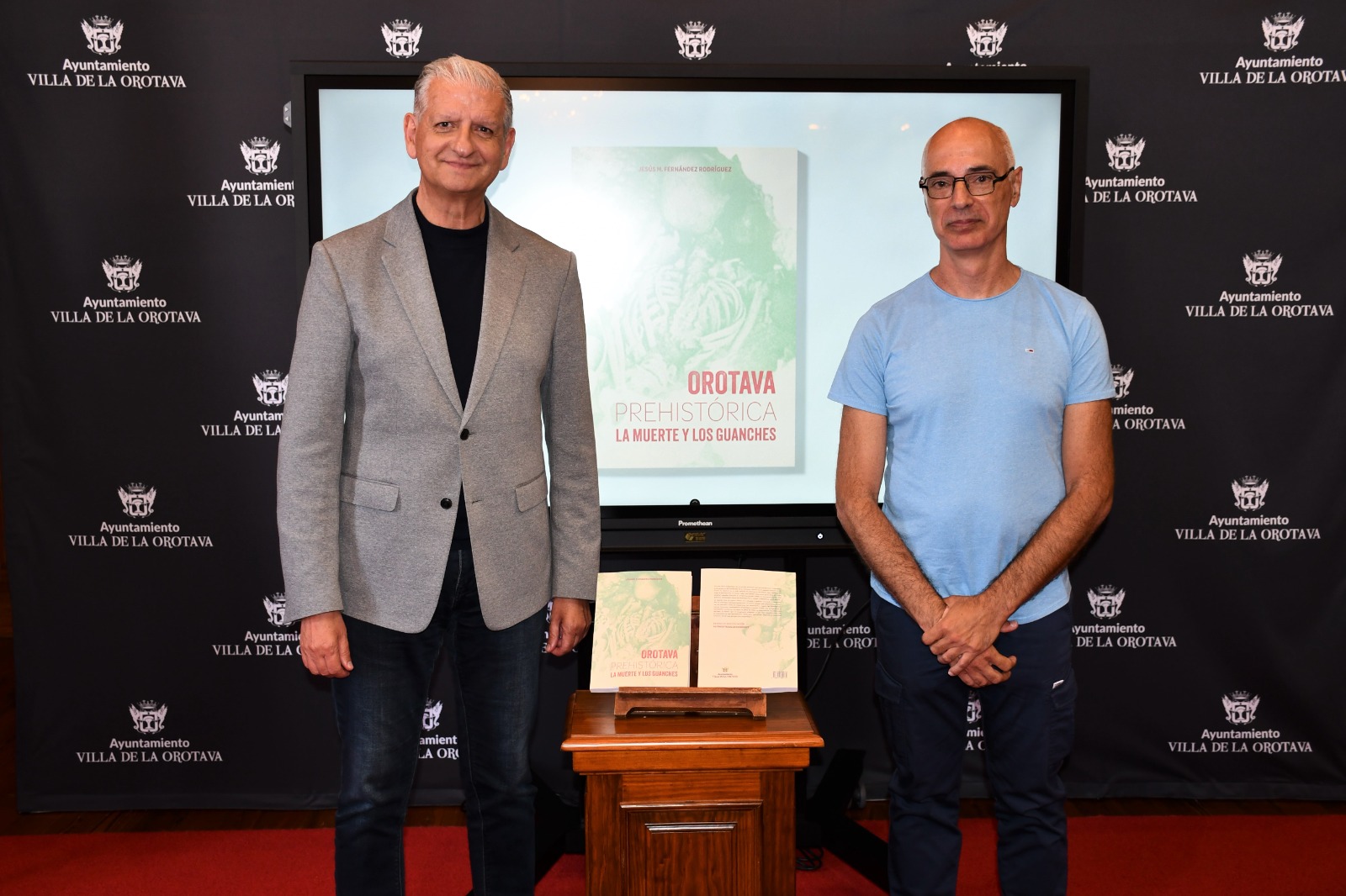 ‘La Orotava prehistórica. La muerte y los guanches’ es el nuevo trabajo de investigación de Jesús M. Fernández Rodríguez, obra ganadora del Premio de Investigación Alfonso Trujillo que convoca cada dos años el Ayuntamiento de La Orotava, a través de la concejalía de Educación y Cultura. El Salón Noble del consistorio villero acogió este viernes [12 de mayo] la presentación del libro de la mano del propio autor y el alcalde de La Orotava, Francisco Linares.