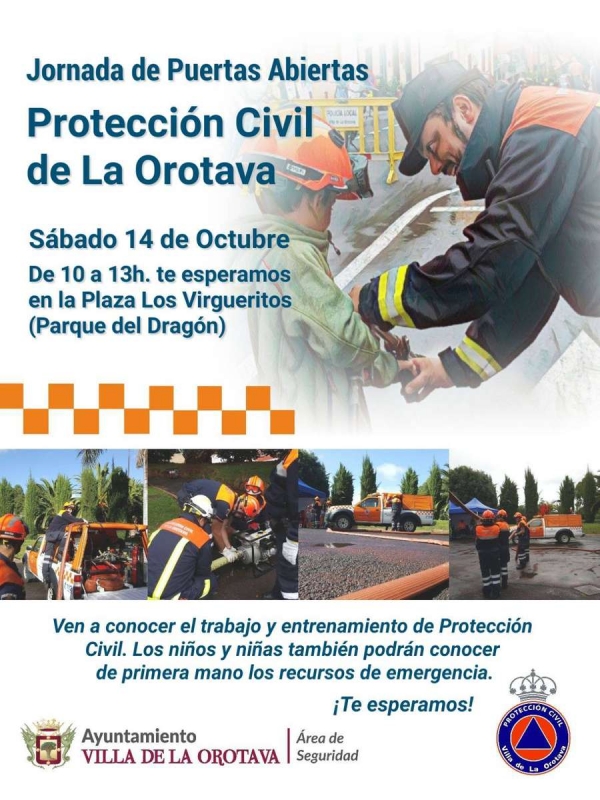 Protección Civil Villa de La Orotava realizará el próximo sábado, 14 de octubre, en la Plaza Los Vigueritos (Parque El Dragón en Carmenaty), una nueva jornada de Puertas Abiertas. Será de 10:00 a 13:30 horas.