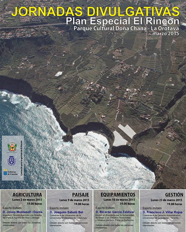 La primera charla el 2 de marzo, contará con la participación de Joseph Montasell, ingeniero Técnico Agrícola y ex Director del Parque Agrario del Bajo Llobregat. Anteriormente, ha trabajado principalmente en la preservación, desarrollo y gestión de espacios agrarios y en proyectos internacionales en las repúblicas de Haití y China. Esta jornada se centrará en agricultura, concretamente en el Plan Especial de la zona El Rincón, en el Valle de La Orotava. Aprobado en el año 1997, recoge una serie de medidas que tienen como objetivo la mejora de este lugar. La propuesta que recoge es la de instalar una red de riego a presión en la zona para su modernización, racionando el uso del agua, depurándola y reutilizándola para la gestión ecológica. Por otra parte, contiene líneas de acción referentes al asesoramiento y apoyo a la comercialización de cultivos en diferentes mercados locales, así como establecimientos hoteleros o comedores escolares.