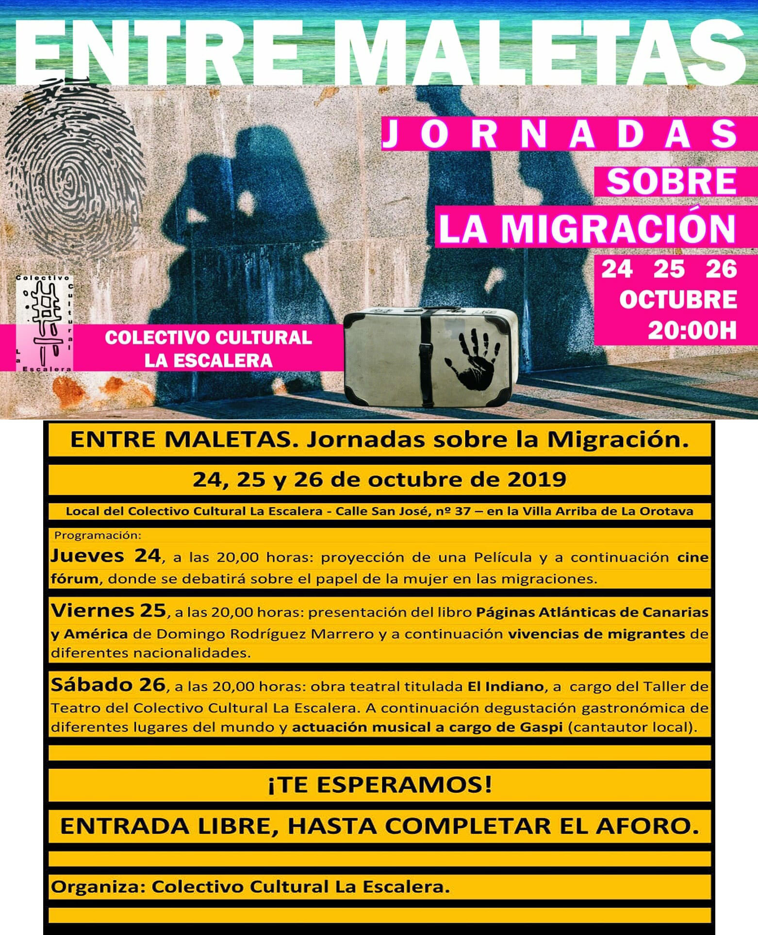 El Colectivo Cultural La Escalera organiza de jueves a sábado unas jornadas sobre la migración, tituladas ‘Entre Maletas’ para abordar “una realidad con la que estamos conviviendo diariamente y que también supuso una aventura para muchos de nuestros bisabuelos, abuelos y padres”.
