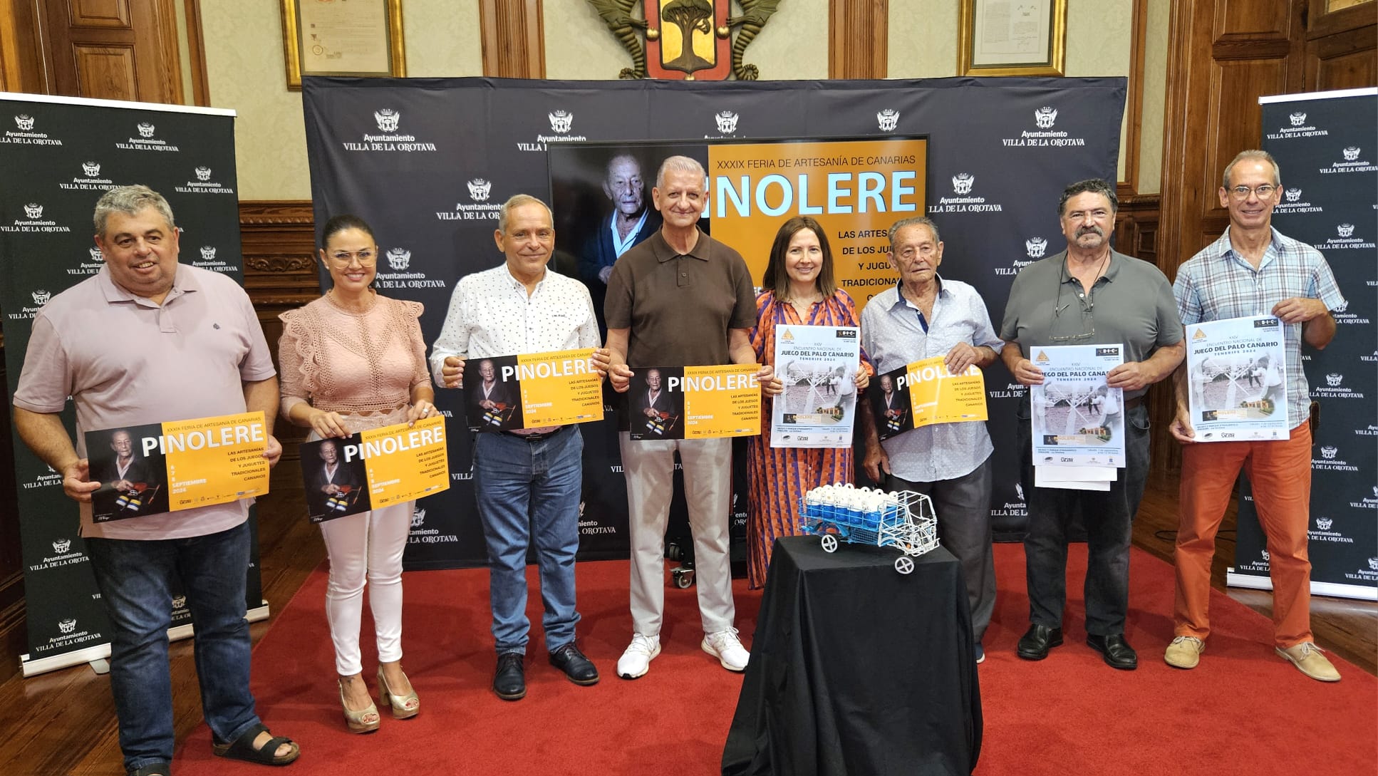 La muestra este año estará dedicada a las artesanías de los juegos y juguetes tradicionales canarios. El cartel anunciador y los principales actos que conformarán el programa han sido presentados este jueves 1 de agosto en el salón noble de la Casa Consistorial villera de la mano del alcalde Francisco Linares; la Directora General de Deportes Autóctonos del Gobierno de Canarias, Lorena Hernández Labrador; el consejero insular Efraín Medina; el presidente y gerente de la Asociación Cultural Pinolere, Leoncio Luis y Jesús García, respectivamente, y la concejala delegada de este núcleo urbano, Yurena Luis. El acto también contó con la presencia del Presidente de la Federación de Juego de Palo Canario, Guillermo Martínez, ya que este año el recinto acogerá, paralelamente, el XXIV Encuentro Nacional del Juego del Palo Canario. Este evento, que se desarrollará el día 7, se dividirá en dos partes, por un lado, la cultural con el pase de vídeos, carteles, muestra de paneles…; y, por otro lado, el festival del palo canario, contándose con los maestros y jugadores federados que harán exhibición en el propio recinto. Por ello se contará con la participación de cerca de una veintena de clubes-escuela de diferentes puntos de las islas.