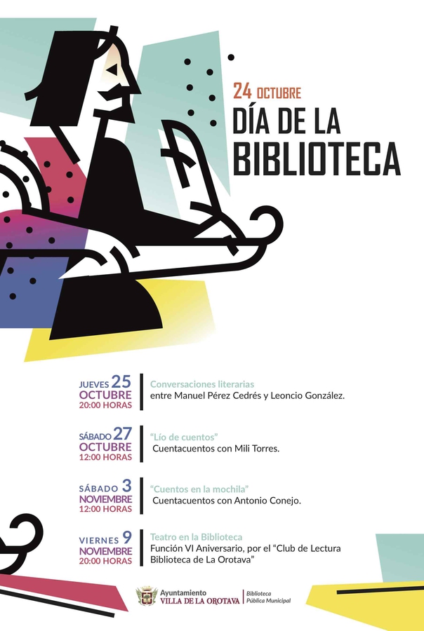 Como cada año La Biblioteca desarrollará un Programa de actividades para celebrar el Día de la Biblioteca, en el que se intenta conseguir que pueda ser atractivo para los diferentes sectores de la población de nuestro entorno, tanto para nuestros más pequeños lectores con varias sesiones de Cuentacuentos, como para un público adulto o familiar con charlas entre escritores o una representación de teatro por integrantes del "Club de Lectura Biblioteca de La Orotava".
