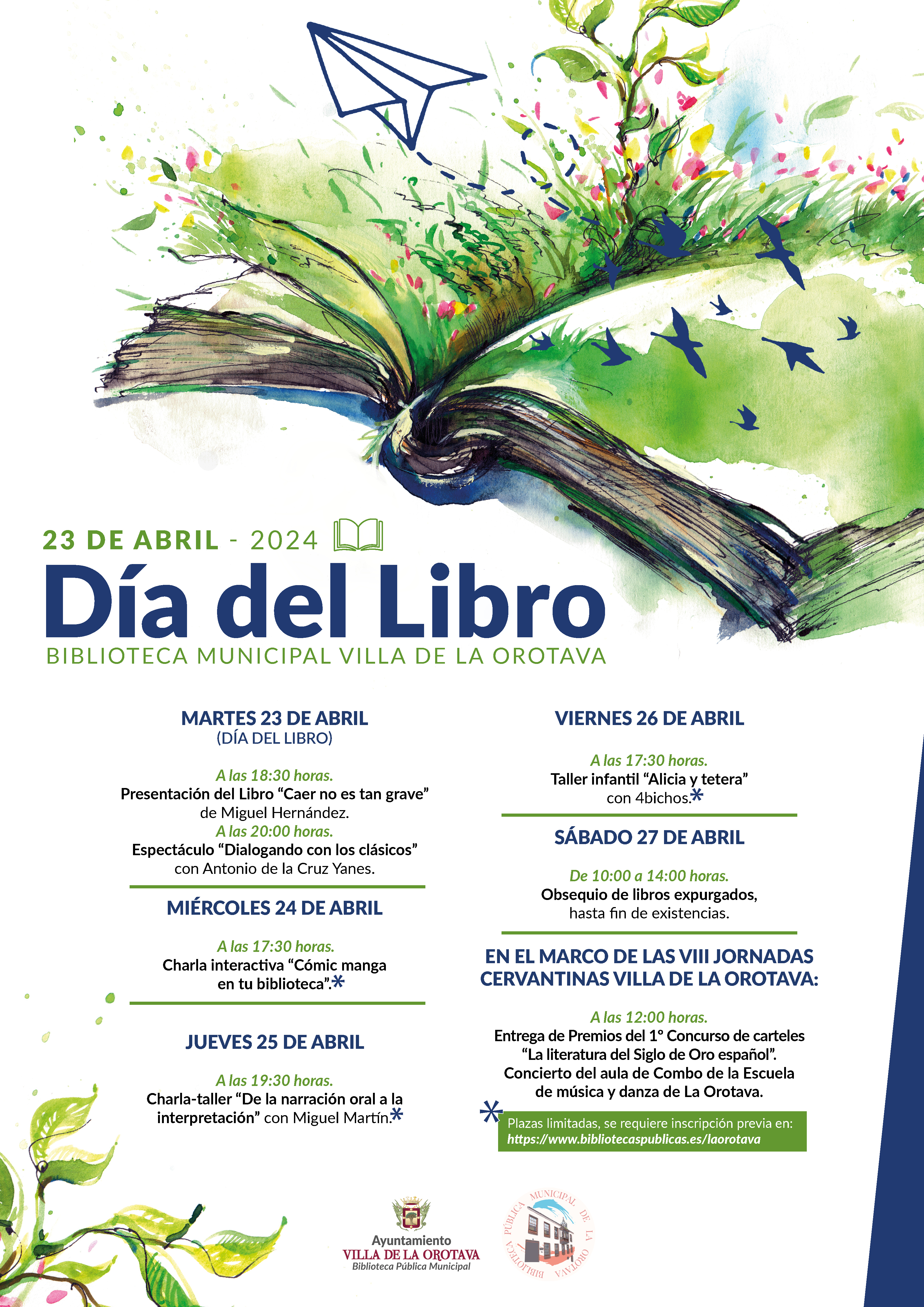 1º) Charla- Taller “De la narración oral a la interpretación” con Miguel Martín, a las 19:30 h. Para participar en este taller se requiere inscripción previa en la Web de la Biblioteca https://www.bibliotecaspublicas.es/laorotava