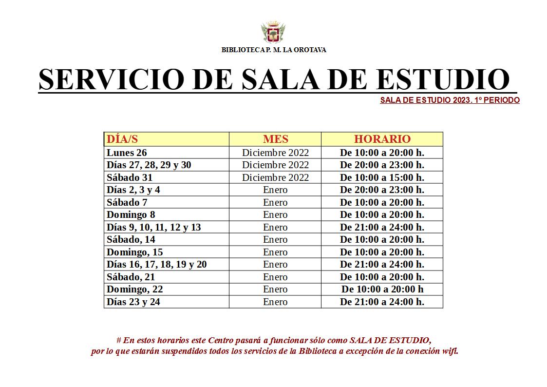 El servicio de sala de estudio se prestará hasta las 23:00 horas del 27 al 30 de diciembre y del 2 al 4 de enero. También habrá este servicio el lunes 26 de diciembre de 10 a 20 horas y el sábado 31 de diciembre de 10 a 15 horas.