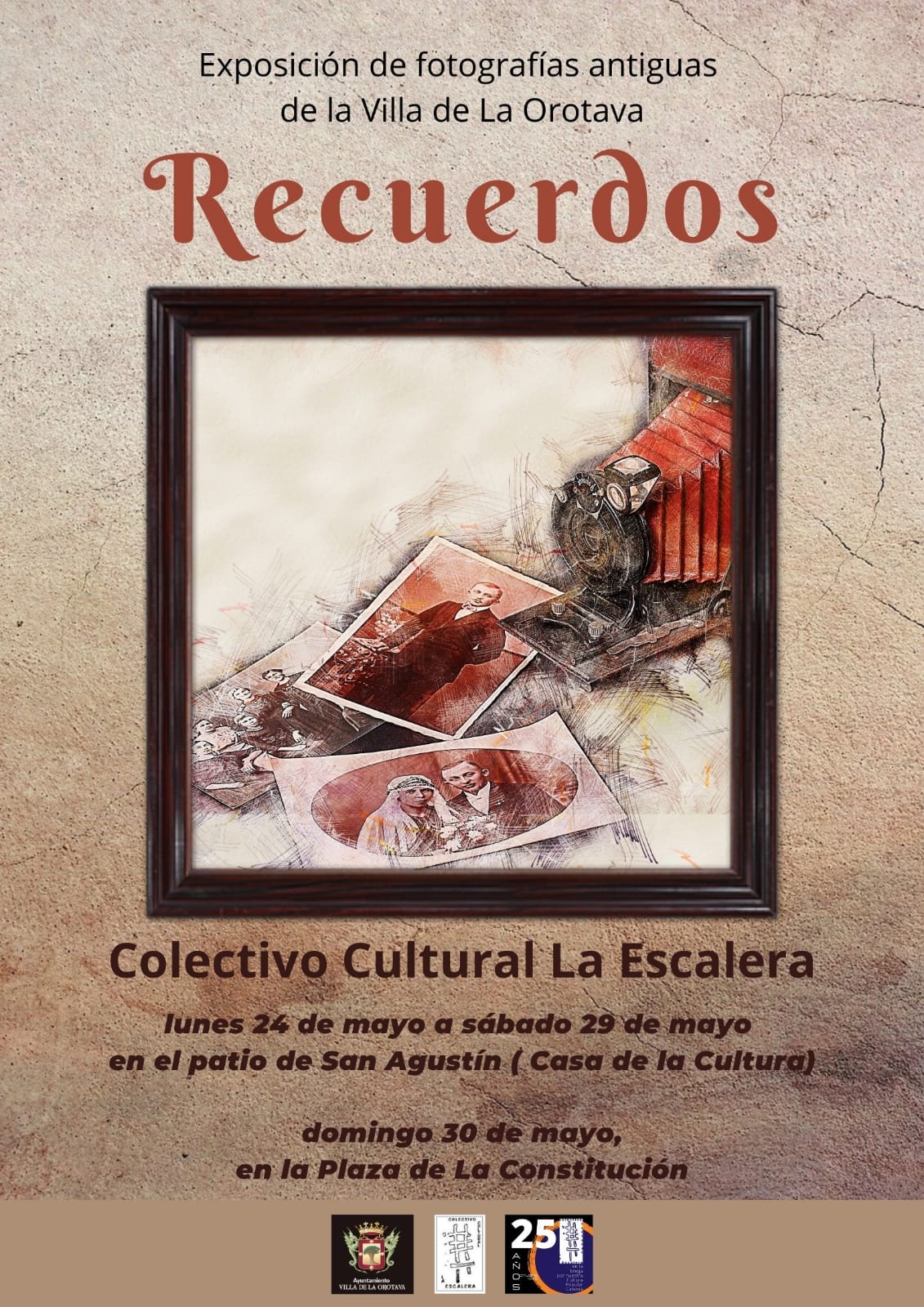 El Colectivo Cultural La Escalera organiza la exposición de fotografías antiguas de La Orotava: ‘Recuerdos’, que se podrá visitar en el Patio San Agustín, de la Casa de la Cultura. La inauguración oficial será el 24 de mayo, a las 18:30 horas, y permanecerá en esta localización hasta el 29 de mayo. Mientras que el domingo 30 de mayo, y con motivo de la celebración del ‘Día de Canarias’, la muestra podrá visitarse en la Plaza de la Constitución. Junto con la muestra fotográfica se contará con una exposición de juguetes y juegos tradicionales.