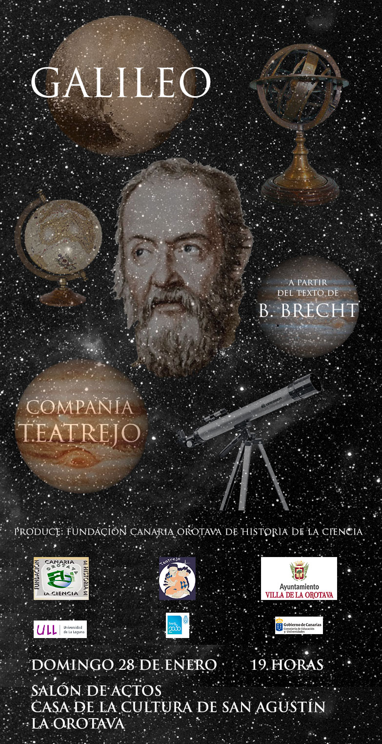 La Casa de la Cultura de San Agustín acoge el próximo 28 de enero, a partir de las 19:00 horas, la obra de Galileo que promueve la Fundación Canaria Orotava de Historia de la Ciencia. Fundoro tiene como objetivo la promoción y divulgación de la historia de la ciencia y con este propósito acude ahora también al teatro. Galileo Galilei es un gigante de la ciencia y de la cultura, y se presenta a través de una adaptación de la obra de Bertolt Brecht realizada por Manolo García y representada por la Compañía Teatrejo.