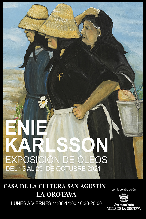 Enie Karlsson (Trollhattan, Suecia, 1942), residente en Tenerife desde hace más de cuarenta años y ya canaria de adopción, centra su obra en la pintura bucólica, llena de naturaleza, bodegones y tipismo canario sus lienzos. Desde su particular universo pictórico retrata la mujer rural, sillas, macetas, sombreros y flores. Nos regala una mirada a la inmensidad del paisaje isleño desde el detalle donde se presenta al espectador en poética sintonía.
