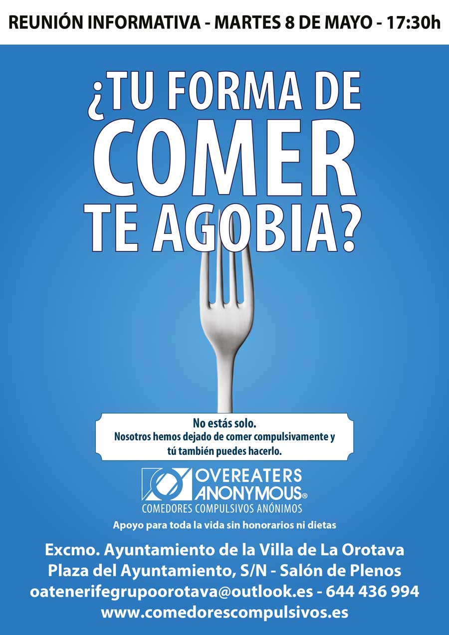 La Asociación de ​Comedores Compulsivos Anónimos​ de Tenerife celebrará una ​charla informativa​ el martes ​8​ ​de mayo, a las 17:30 horas​, en el salón de plenos del ​Excmo. Ayuntamiento de la Villa de La Orotava​. Todas las personas interesadas están invitadas.
