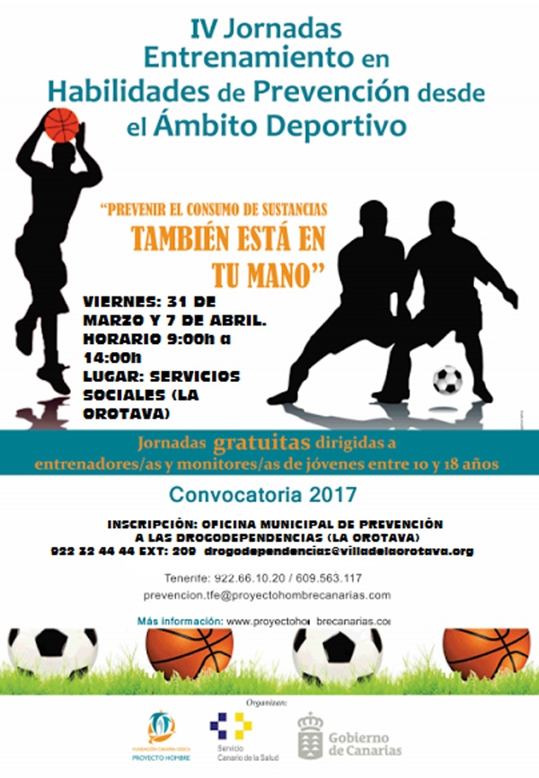 Continuando con el objetivo de de promover alternativas de ocio saludable entre la población, y más específicamente, entre los jóvenes villeros, el área de Drogodependencias del Ayuntamiento de La Orotava organiza la cuarta edición de las Jornadas de Entrenamiento en Habilidades de Prevención desde el Ámbito Deportivo que se desarrollará en dos sesiones, el 31 de marzo al 7 de abril en el Centro de Servicios Sociales de La Orotava.