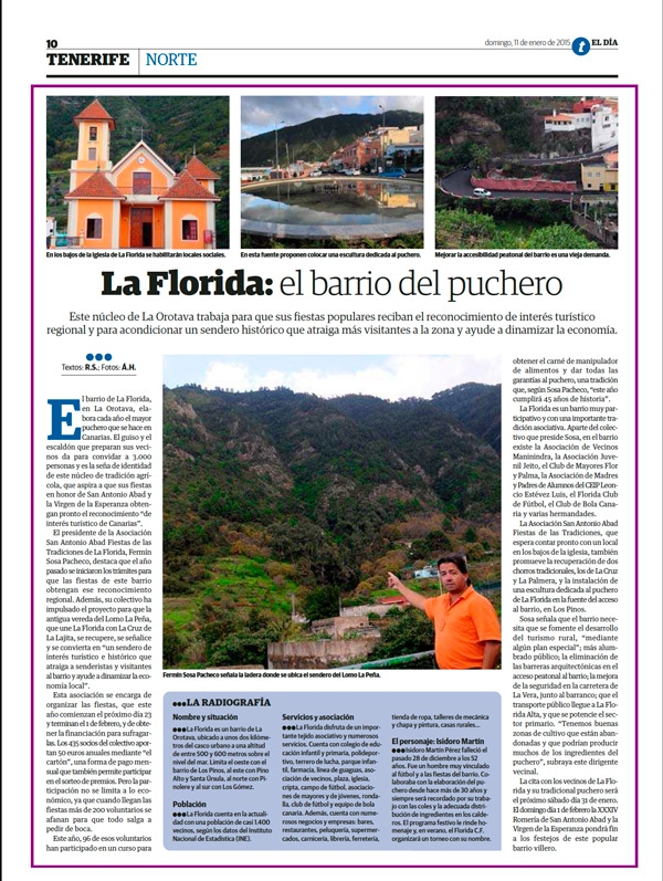 El barrio de La Florida, en La Orotava, elabora cada año el mayor puchero que se hace en Canarias. El guiso y el escaldón que preparan sus vecinos da para convidar a 3.000 personas y es la seña de identidad de este núcleo de tradición agrícola, que aspira a que sus fiestas en honor de San Antonio Abad y la Virgen de la Esperanza obtengan pronto el reconocimiento "de interés turístico de Canarias".