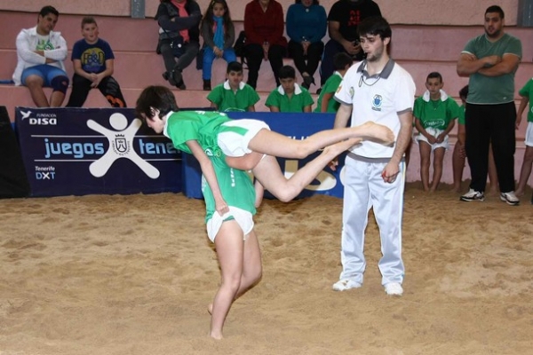 Los grandes protagonistas de la gran fiesta en La Florida fueron los niños y niñas de la Escuela Municipal de La Orotava y la Escuela de Punta Brava. Fue una mañana de muy buenas sensaciones y con un repertorio cargado de mañas. La Orotava apuesta por políticas de igualdad y varias son las niñas que participan en este campeonato. Wladimir es el entrenador del conjunto orotavense, mientras que Juan Carlos Suárez viene desarrollando una importante labor en el trabajo con las categorías inferiores en el municipio portuense. En la imagen, una agarrada en el terrero de La Florida.