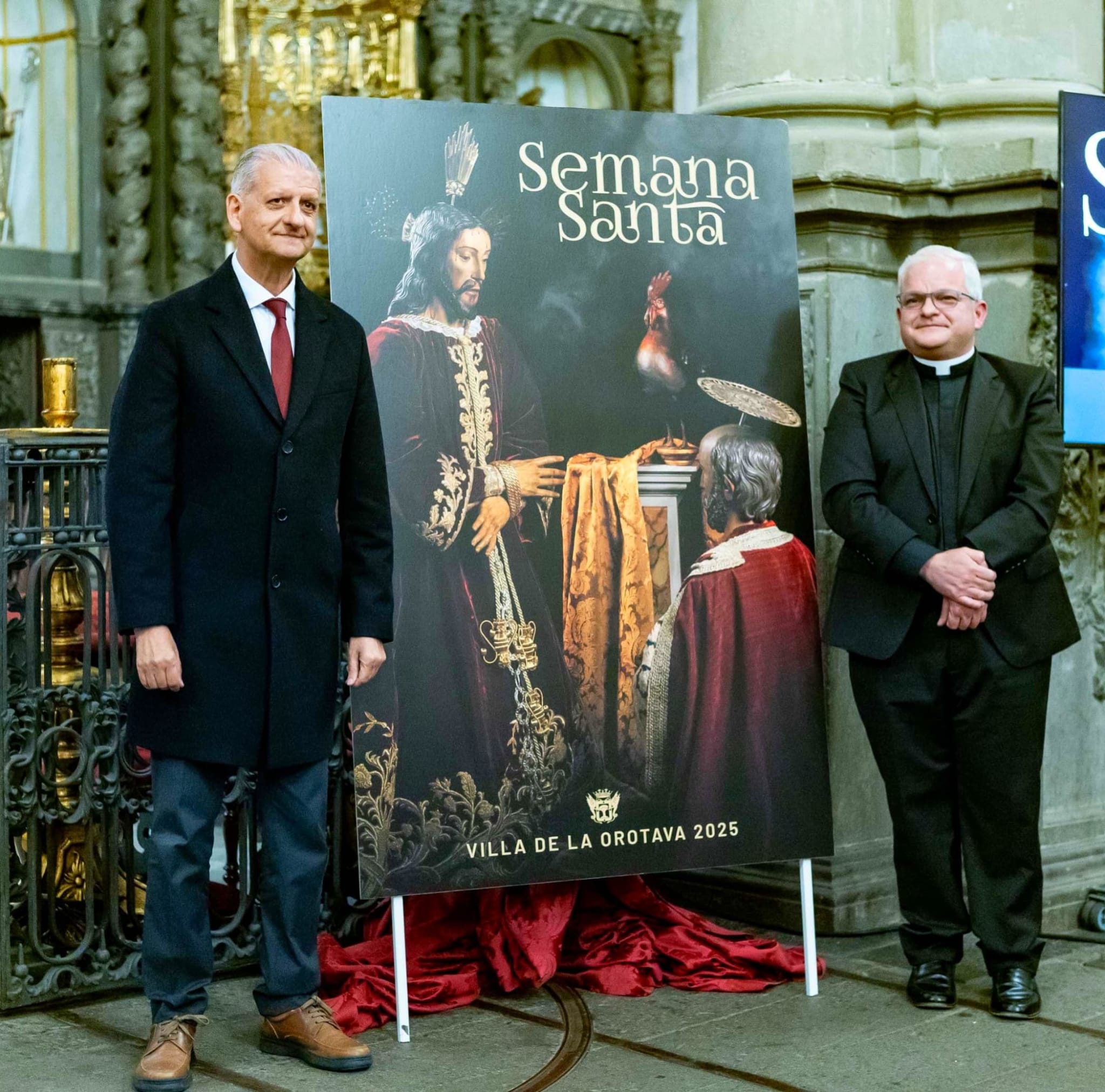 El cartel anunciador de este año es del Señor Preso y las Lágrimas de San Pedro, que procesionan cada Martes Santo por las calles de la Villa. La primera imagen, de candelero y datada en el siglo XVII es atribuida a Francisco Alonso de la Raya, integrante de la Escuela de Garachico. Por su parte, el San Pedro Penitente, es atribuida a Sebastián Fernández Méndez “el Viejo”, si bien es cierto que su actual fisonomía responde a una intervención efectuada por Fernando Estévez con anterioridad a 1820. Destaca la mirada perdida a la vez que resignada del Cristo, cuyas manos se encuentran anudadas con un cíngulo dorado, y cubierto con una notable túnica de terciopelo de seda de color rojo burdeos, ornamentada con motivos vegetales que tiene su origen en el siglo XVIII. En idéntica actitud de resignación, tan solo interrumpida por sus icónicas lágrimas, se manifiesta la imagen de Pedro, quien complementa un cortejo procesional que constituye una de las representaciones de mayor antigüedad de la Semana Santa de la Villa de La Orotava.