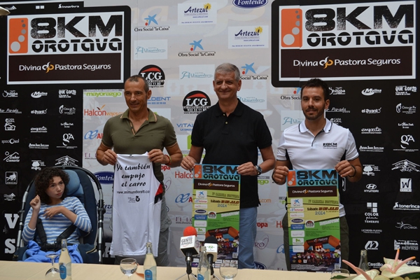 La cuarta edición de la '8KM Orotava-Divina Pastora Seguros 2014' contará con un récord de inscritos, después de que se rebasara el límite de 600 participantes fijado por la organización. Así se dio a conocer en la presentación de la prueba, que tuvo lugar este jueves [17 de julio] en el Restaurante Sabor Canario, y a la que asistieron el alcalde de la Villa de La Orotava, Francisco Linares; el atleta valenciano, José Carlos 'Josele' Ferré, y su hija María (promotores de 'Mi Mundo Rett'); y el director del certamen, Marcos Hernández Guardia.