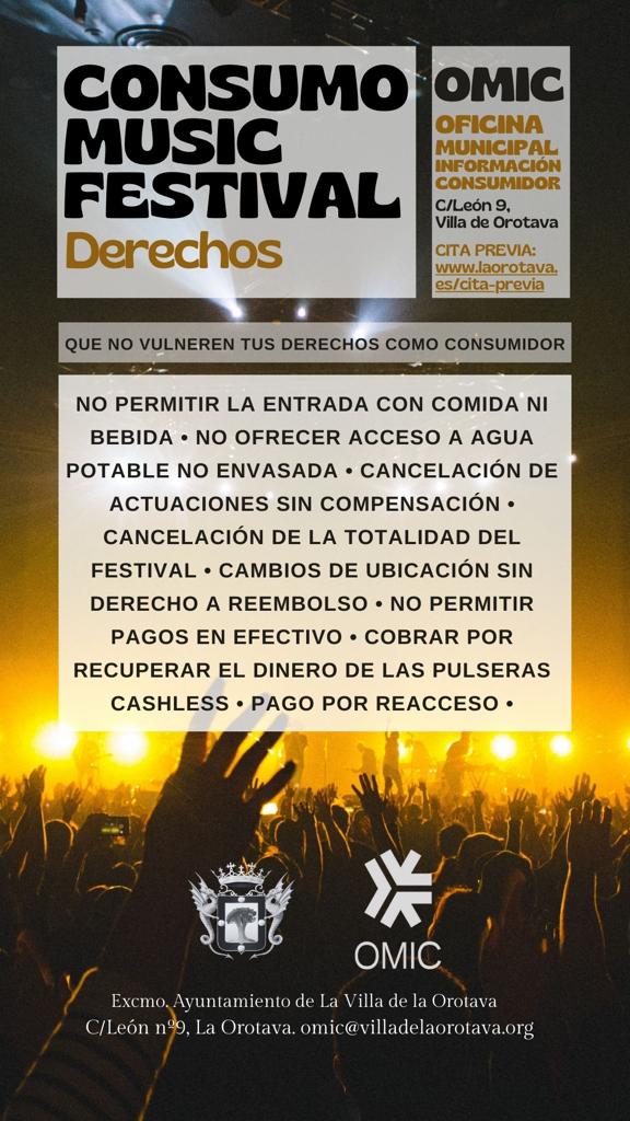 En esta época del año se celebran numerosos eventos culturales y de ocio alternativo. Cada año son más los festivales de música que proliferan en todo el país, pero en muchos casos imponen normas que no son legales. Con el objetivo de que se pueda disfrutar de estas actividades sin incidentes y el ciudadano conozca los derechos y las medidas de protección que le asisten, así como reconocer los abusos, la Oficina Municipal del Consumidor (OMIC) de La Orotava lanza una campaña informativa con las advertencias y consejos.