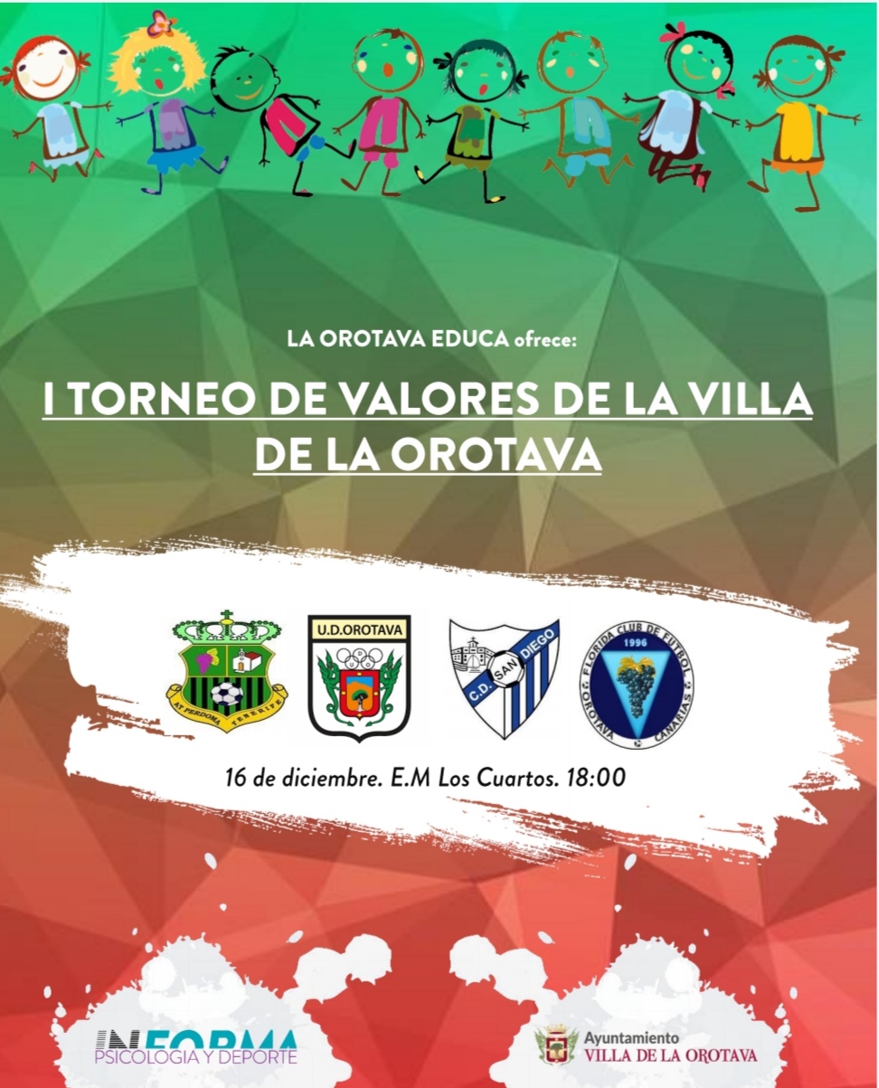 El próximo 16 de diciembre se disputará el Torneo de Valores Villa de La Orotava, en el que se enfrentan los cuatro equipos alevines de los clubes UD Orotava, San Diego, La Perdoma y el Florida. Los partidos se disputarán, a partir de las 18.00 horas, en el Estadio Municipal de Los Cuartos. El objetivo de este primer y novedoso torneo es inculcar los buenos valores, fomentando la deportividad, el respeto y el juego limpio, a la par de favorecer en el crecimiento personal de los jugadores.