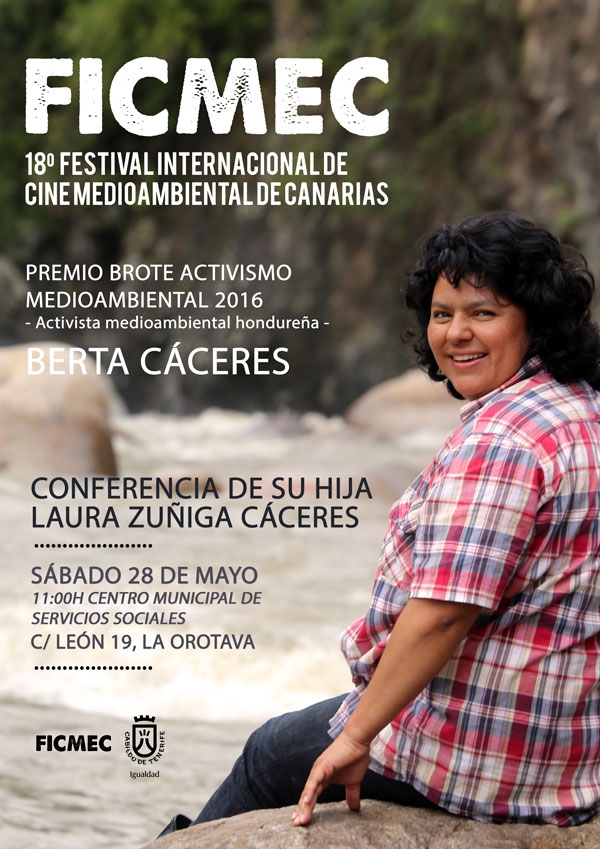Una de las actividades propuestas dentro del FICMEC, 18 º Festival Internacional de Cine Medioambiental de Canarias se realizará este sábado en La Orotava. Se trata de la conferencia impartida por Laura Zuñiga Cáceres, hija de Berta Cáceres que fue asesinada en su país Honduras por defender los derechos humanos de la comunidad indígena y se le concede el premio Brote Activismo Medioambiental 2016.